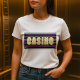 Adicione talento lúdico ao seu guarda-roupa com esta camiseta retro feminina do casino. Mostrando uma bolinhas atraente e brilhantes contornos ao estilo neon sobre um fundo listrado, esta camisa é perfeita para visto casual, noites de jogos ou eventos temáticos. Confortável e na moda, é divertido vintage a vibrações de Vegas.