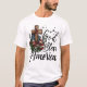 Esta camiseta branca apresenta uma cruz russa de madeira enfiada com a bandeira americana, realçada por morangos vermelhos e folhas verdes. O texto "América Deus abençoe" é escrito elegantemente num guião fluente ao lado da cruz, expressando fé e patriotismo.