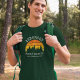 Rustic Pine Trees Summer Retro Sunset Family Reunion Forest T-Shirt Verde. Tamanhos de camisa disponíveis para todos na família. Muitas cores para escolher. Excelente para férias de reagrupamento familiar, de acampar nas montanhas a umas férias na cabine da família na floresta perto do lago. Personalize com seu nome de família, local, ano ou data e muito mais.