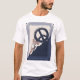 Sisyphus que empurra um símbolo de paz de pedra acima da montanha. Desenho original do estilo do vintage, com beira decorativa e do texto.