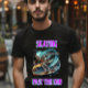 Um esqueleto com ossos batendo, cruzando em um skate no topo de um salto de skate Park. O esqueleto está realizando truques e deslizando suavemente sobre a pista dos parques. O fundo mostra uma grande quantidade de saltos e se volta na pista de corrida à distância. Com as palavras dizendo. Patinando no passado O fim Prepare-se para skate além dos limites do estilo com nossa camiseta de "Skating Past The End"! Este design elegante e atraente apresenta um esqueleto destemido que desliza sem esforço sobre um salto no skate Park. Com os ossos batendo e os truques sendo feitos, esta camisa captura a emoção e o entusiasmo do skate como nenhuma outra. A atenção aos detalhes nesta design é realmente notável. Os movimentos suaves do esqueleto e a intrincada faixa do skate criam um sentido de movimento e energia. À medida que o esqueleto conquista sem medo os saltos e as voltas, o fundo apresenta uma vasta pista de corrida, adicionando um toque de aventura ao design geral.