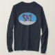 O texto de esqui feito de esquis vermelhos e uma deriva de neve em um oval é um divertido design de presente de esqui de neve no inverno para esquiadores de descida e de campo cruzado.
