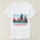 Uma ilustração do computador da skyline do Gold Coast de Chicago sobrepor na bandeira da cidade. O texto "CHICAGO" publica-se na parte inferior da ilustração em uma pia batismal vermelha.