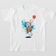 Esta ilustração vibrante captura um gato cartoon com uma expressão feroz, saltando dinamicamente em direção a um aro de basquete. O gato está vestido com uma camisa de basquete laranja, com shorts iguais, e tem uma faixa preta escorrendo pelas costas. O fundo apresenta inchaço de tinta azul e laranja, enfatizando o movimento e a energia da cena. A cauda do gato se curva artificialmente à medida que se propicia para cima, pata estendida para marcar um pedaço com a bola de basquete. Este trabalho de arte lúdico e enérgico é perfeito para entusiastas do esporte e fãs de ilustrações animais dinâmicas.