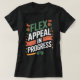 Uma t-shirt com o slogan motivador "Flex Appeal In Progress" em texto colorido tipografia e gráficos, incluindo sinos e fitas.