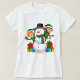 Uma t-shirt branca com uma imagem de desenho animado de um boneco de neve com um chapéu preto e um cachecol vermelho e verde, rodeada por dois elfos de desenho animado e vários presentes embrulhados. Os elfos estão vestindo roupas e chapéus verdes, e um está segurando um pequeno presente. Os presentes são embrulhados em papel vermelho, azul e verde com arcos. O boneco de neve tem nariz de cenoura e botões pretos. A imagem é um estilo de desenho animado simples e colorido.