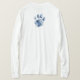 Gato de brindle de cinza de aquarela, cômoda, rodeado de flores rosa e azuis. Impressão de pata de gato nas costas.