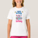 Adorável sob a camisa de aniversário do mar com uma sereia feliz com um sorriso fofo e bochechas rosa rosadas. Ela tem cabelos brancos longos e fluentes adornada com flores pequenas, rosa e azuis. Ela está vestindo um biquíni de casca rosa e tem uma cauda de peixe com escamas verdes. Ela está sentada rodeada de conchas cor-de-rosa, azuis e verdes e coral azul, rosa e verde. Há uma estrela rosa feliz e um peixe listrado azul com ela e corações e bolhas flutuando ao seu redor. Acima e abaixo da imagem estão modelos em texto azul e rosa para adicionar todos os detalhes da sua parte.