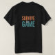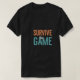Uma fonte ousada e estilizada domina o centro da camisa, lendo "SOBREVIVER O JOGO" em uma matiz ameaçadora e vermelha. Ao redor do texto está um padrão caótico e abstrato de linhas e formas distorcidas, sugerindo um mundo postado-apocalíptico ou distópico. O design geral transmite uma sensação de perigo, urgência e necessidade de sobrevivência num ambiente hostil.