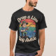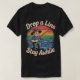 Este design apresenta uma t-shirt preta com o texto "Drop a Line" curvada no topo e "Keep Awhile" curvada no fundo numa letra branca estilizada. No centro está um desenho animado de um menino pescando em um lago com um pôr do sol ao fundo.