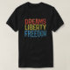 Esta camiseta apresenta as palavras Dreams Liberty Freedom em um estilo ousado e multicolorido de grafite. Cada palavra é uma cor diferente, com uma textura ligeiramente angustiada, dando-lhe uma legal vibração urbana