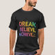 A design de camiseta apresenta o texto "Sonho. Acredite. Alcançar.." em um gradiente de cores vibrantes, com abstrato e padrões ao seu redor. O design é ousado e atraente, e as cores são brilhantes e alegres. O texto é escrito em negrito e as palavras são espaçadas de forma uniforme. O design é centrado no peito da camiseta, e está cercado por uma borda branca. O design é simples mas eficaz, e é certo que chama a atenção de quem o vê.