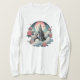 Uma ilustração sonhadora de um castelo majestoso que repousa numa nuvem fofinha, entrelaçada com rosas florescentes que cascata graciosamente. O fundo pastel macio melhora a vibração etérea, criando um design mágico e romântico perfeito para t-shirts.