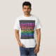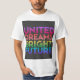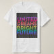 A design da camiseta apresenta o texto "O Futuro Brilhante dos Sonhos Unidos" em um vibrante gradiente do arco-íris, começando do roxo e terminando em rosa. O texto é colocado sobre fundo preto e é apresentado em caracteres modernos e geométricos. O design transmite uma mensagem de esperança, unidade e otimismo, com as cores que simbolizam a diversidade e a inclusão.