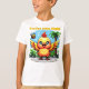 Um pintinho amarelo alegre com olhos brilhantes e bochechas rosadas espalha suas asas com entusiasmo. Uma abelha amigável paira perto. As palmas verdes e o céu azul criam uma sensação tropical quente. A frase "Sorrisos voam" em letras amarelas melhora o humor alegre.