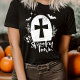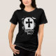 Camisa divertida do Dia das Bruxas com lápide, cruz, aranha, crânio, morcegos e flores. Design branco com efeito leve de sobreposição de granulado texturizado. A camisa assustadora perfeita para festas de Halloween, truques ou tratamentos, e fotos de grupo memoráveis.