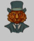Um tigre que veste um fato teal e um chapéu de cima é representado contra um fundo mudo, dando uma aparência elegante e caprichosa. A expressão séria do animal é enfatizada pelo traje formal.