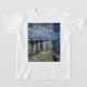 Algodão em Cordeville. Vincent Willem van Gogh. Paisagem noturna em tons azuis e amarelos escuros. Há uma ponte sobre o rio. No primeiro plano, um homem e uma mulher caminham pelo cais. As estrelas estão brilhando no céu. Reprodução de famosas imagens de arte no dominio público.