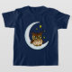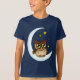 Uma coruja-bebê marrom giro e giro sentada em uma lua com estrelas ao redor em pano de fundo azul