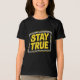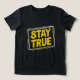 Ce design met en avant le slogan “Stay True”, avec une typographie audacieuse et stylisée. Le texte est de couleur jaune vif, se détachant sur un fond contrastant. Une bordure ou un cadre autour du texte lui donne de la structure et de la visibilité. L’esthétique générale transmet un sentiment d’authenticité et d’encouragement, résonnant avec le message de rester fidèle à soi-même ou à ses valeurs.