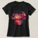 Uma pintura decorativa de paisagem aquática de uma praia com palmeiras após o pôr do sol.