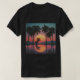 A tiny squirrel silhouette sits beneath towering palms as a giant neon sun and mountains reflect in a glowing grid pool, creating a calm retro dreamscape.