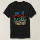 Esta camiseta preta apresenta o texto "SWEAT. LUTA. SUCEDIDO." empilhado verticalmente em uma fonte em negrito, ligeiramente angustiada com cores azul, vermelha e verde. Abaixo do texto está um gráfico de um indivíduo muscular, que parece ser um homem de pele clara com cabelo escuro curto, realizando um exercício de exercício de rua, possivelmente em bares paralelos. O fundo tem linhas dinâmicas e gotas de água, enfatizando esforço e conquista.