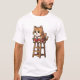 A cute cartoon cat with wide, expressive eyes sits on a tall wooden chair, captured in a moment of pure surprise. The character wears bright red shorts and a small whistle hanging from its neck, adding a playful lifeguard vibe. Soft fur textures, warm brown and cream tones, and clean bold outlines give the illustration a polished, friendly look. The pose, tiny paws, and curious facial expression create a charming and humorous scene that feels lively and full of personality against the dark background.