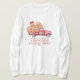 Um caminhão vermelho clássico transborda com biscoitos gigantes. Uma coroa verde adiciona um toque festivo na porta. Há 4 linhas de texto que você pode personalizar para criar apenas a camiseta feminina de biscoitos de Natal certa.