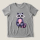 Um guaxinim de desenho com olhos grandes e expressivos e pelo liso é representado sentado sobre suas pernas traseiras. O pelo apresenta tonalidades de cinza e cor-de-rosa, criando um olhar lúdico e caprichoso