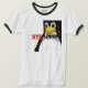 na parte dianteira um PIC do tux com um texto escrito "SYSADMIN isto é terra de Linux, nas noites quietas u pode ouvir a repartição das máquinas das janelas" na parte traseira um texto escrito de "administrador sistema"
