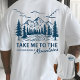 The text “Take Me to the Mountains” celebrates the call of nature, while the simple blue linework gives it a timeless vintage look that pairs perfectly with outdoor gear or casual streetwear.