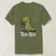Esta camiseta verde-oliva apresenta um Tyrannosaurus Rex verde, giro e cartoonado, com sotaques azuis e amarelos, sentada e segurando uma caneca marrom a vapor de chá com seus pequenos braços. Abaixo do dinossauro, o texto "Tea-Rex" é escrito em uma fonte branca lúdica. O design é um trocadilho humorístico que combina o dinossauro com o amor pelo chá