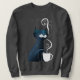 Uma gata preta com realces azuis testa a temperatura do chá com a cauda. O vapor sai da xícara dela.