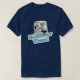 Tshirt do tempo do martelo. Ilustração do vintage de uma cara que balança um martelo em um prego. Ilustração preto e branco, fundo tan, e luz - texto azul.