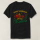 Esta imagem mostra uma camiseta preta com o texto festivo "TÊM A SI PRÓPRIO UMA Feliz PEQUENA de Natal" numa combinação de letras amarelas, vermelhas e verdes. Pequenos gráficos de Natal, como um chapéu de Papai Noel, um presente, uma árvore de Natal, e um coração se soma ao alegre design de Natal.