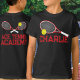 Bright red tênis, raquete e bola com seu próprio nome embaixo do gráfico na frente e seu clube ou outras palavras no sentido inverso ou personalize com seu próprio ditado. Arte gráfica original e design por Sarah Trett para www.mylittleeden.com no Zazzle.
