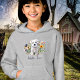 A capuz de cinza da menina com a imagem de cão terrier da West Highland. O lindo cão branco fica entre flores bonito nesta design. "Amor ocidental" é o texto em azul escuro. Altere o texto, adicione um nome ou elimine o texto. Mostrada em uma camisola pullover com capuz e bolsos dianteiros. A design transfere-se para camisetas, camisas ou tanques em muitos tamanhos.