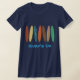 Tee de pranchas riscadas. O texto e o tamanho da prancha podem ser personalizados.