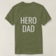Pai Hero Bold Typografia Texturização dirá ao seu pai o quão especial ele é para você. O texto é "pai herói" em letras grandes em branco no centro da frente da camisa verde safari. Você pode personalizar as cores e o texto se desejar.