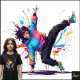 Background/Style: The figure is set against a background of explosive paint splatters (pink, blue, yellow, orange). The style is energetic, urban, and expressive, resembling street art.
