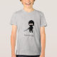 Ninja de desenho animado, bonito mas zangado, vestido de preto, está segurando uma tradicional espada japonesa de katana.