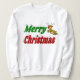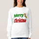 Docinho com Feliz Natal em texto verde e vermelho 3D e uma rena. Camisola disponível para homens e mulheres.