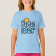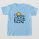 A palavra verão com legal letras azuis onduladas e o sol nasce acima dela.