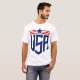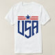 Esta imagem apresenta um elegante e moderno emblema "EUA", estilizado como um escudo patriótico. As letras "EUA" são redigidas em caracteres azuis escuros, angulares, em negrito, formando a base do escudo. Acima dos "EUA", estende-se um bar vermelho com três listras horizontais, erguido por uma estrela azul-escura proeminente, que ecoa elementos da bandeira americana.