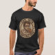 Vintage retro badge design with the words 'Est. [Year of First Kid]' around a sleepy cartoon dad face with coffee cup, dark circles under eyes, distressed texture, muted brown and tan color palette, 70s style illustration, bold outlines, t-shirt graphic, white background, no modern effects