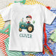 Esta t-shirt personalizada de criança apresenta um rapaz branco num trator verde giro.