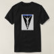 A camisa preta com figura masculina branca outstretched em um triângulo preto, TERAPEUTA da MASSAGEM em bonés azuis datilografa