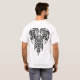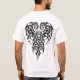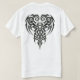 An intricate, symmetrical piece of tribal line art that forms the silhouette of a heart or shield. The design features interlocking curved blades, sharp spikes, and circular flourishes at the top. The metallic, shaded texture gives the graphic a three-dimensional appearance