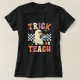 Diseño lindo para Halloween para Maestros con la Frase " TRICK OR TEACH" con linda tipografia Groovy colorida y un pequeño fantasma cargando libros hace de este diseño un diseño ideal para Maestro en Halloween!, No lo pienses y regalale a ese maestro apreciado este lindo diseño de Halloween especial para maestros.